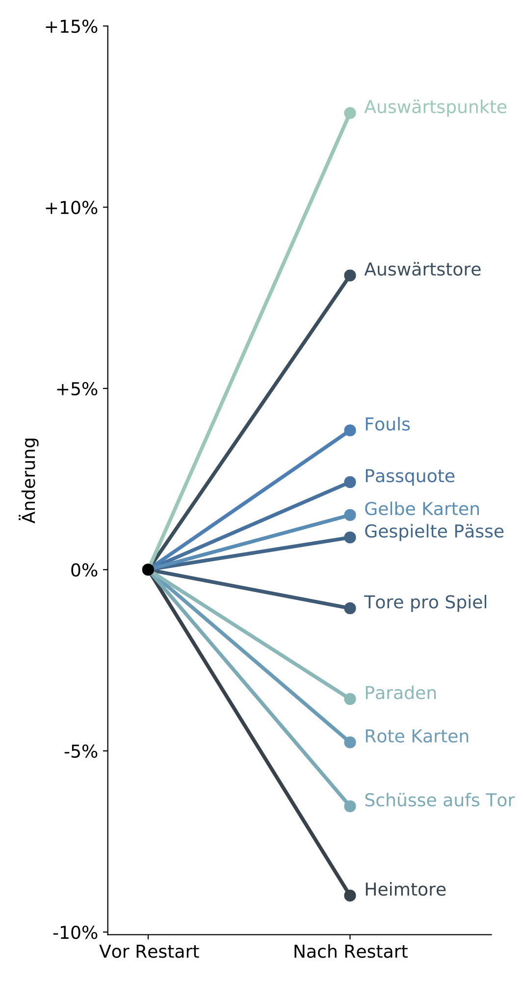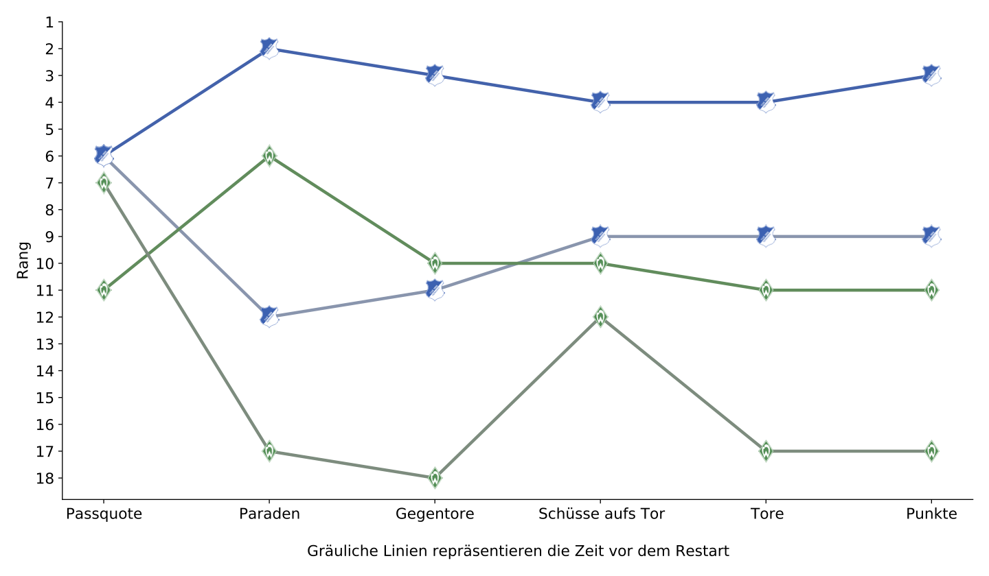 Dies ist das Projekt zu meinem Artikel ‘Bundesliga in Zahlen: Vor und nach dem Corona-Restart’. In diesem habe ich beschrieben, wie sich bestimmte Leistungsstatistiken nach dem Restart der Bundesliga nach der Corona-Unterbrechung verändert haben. Es konnte gezeigt werden, dass einige Mannschaften klar bessere Leistungen abrufen konnten, andere nach der Pause wesentlich schlechter abschnitten. Allgemein ging außerdem der Heimvorteil verloren.